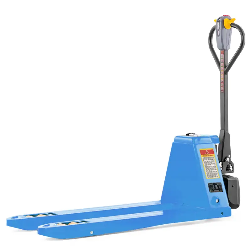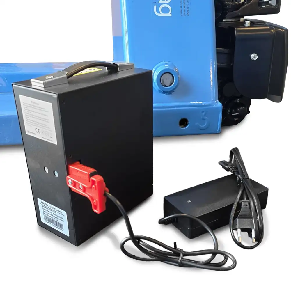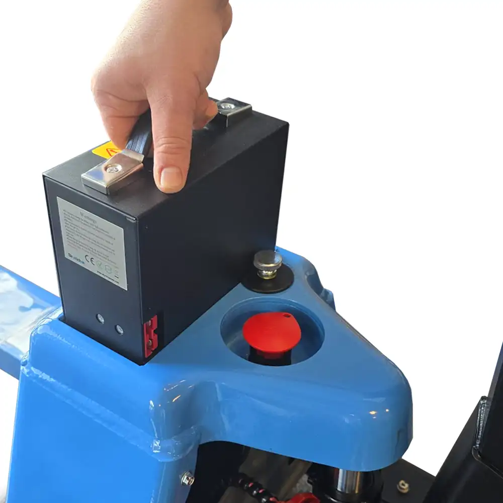 De palletwagen dankt zijn kracht aan de DC-rijregeling, de 0,75 kW-rijmotor, de 0,8 kW-hefmotor en de onderhoudsvrije 48V/15Ah-lithiumbatterij. Dankzij de ingebouwde 220-voltlader is de uitneembare batterij overal eenvoudig op te laden bij een 220-voltaansluiting.