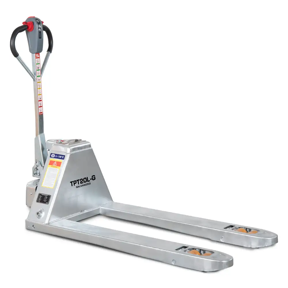De TPT20L-G heeft een robuust gegalvaniseerd frame en een compact design, de vorken hebben standaardvorkafmetingen voor europallets (1150 x 550 mm). De polyurethaan wielen (dubbele vorkwielen) hebben een gemiddelde slijtvastheid en anti-slipfunctie. De palletwagen is geschikt voor hellingen van 6% tot 20%, afhankelijk van de belasting.