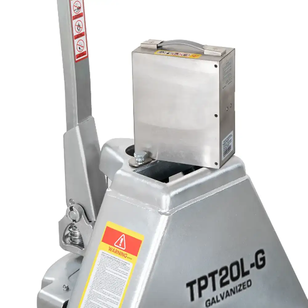 De TPT20L-G is een elektrische palletwagen in vuurverzinkte uitvoering waarmee u eenvoudig zware goederen kunt verplaatsen. Zowel rijden als heffen en dalen gaat elektrisch. Bij uitstek geschikt om een aantal uur per dag pallets mee te kunnen verplaatsen, ook in kleinere ruimtes. Het maximale hefvermogen is 2000 kg. De vorklengte is 1150 mm (standaardvorklengte). De onderhoudsvrije lithium-ion-accu is uitneembaar en is (ook tussentijds) op te laden bij iedere 220-voltaansluiting. Ideaal om te gebruiken in een vochtige of corrosieve omgeving!
