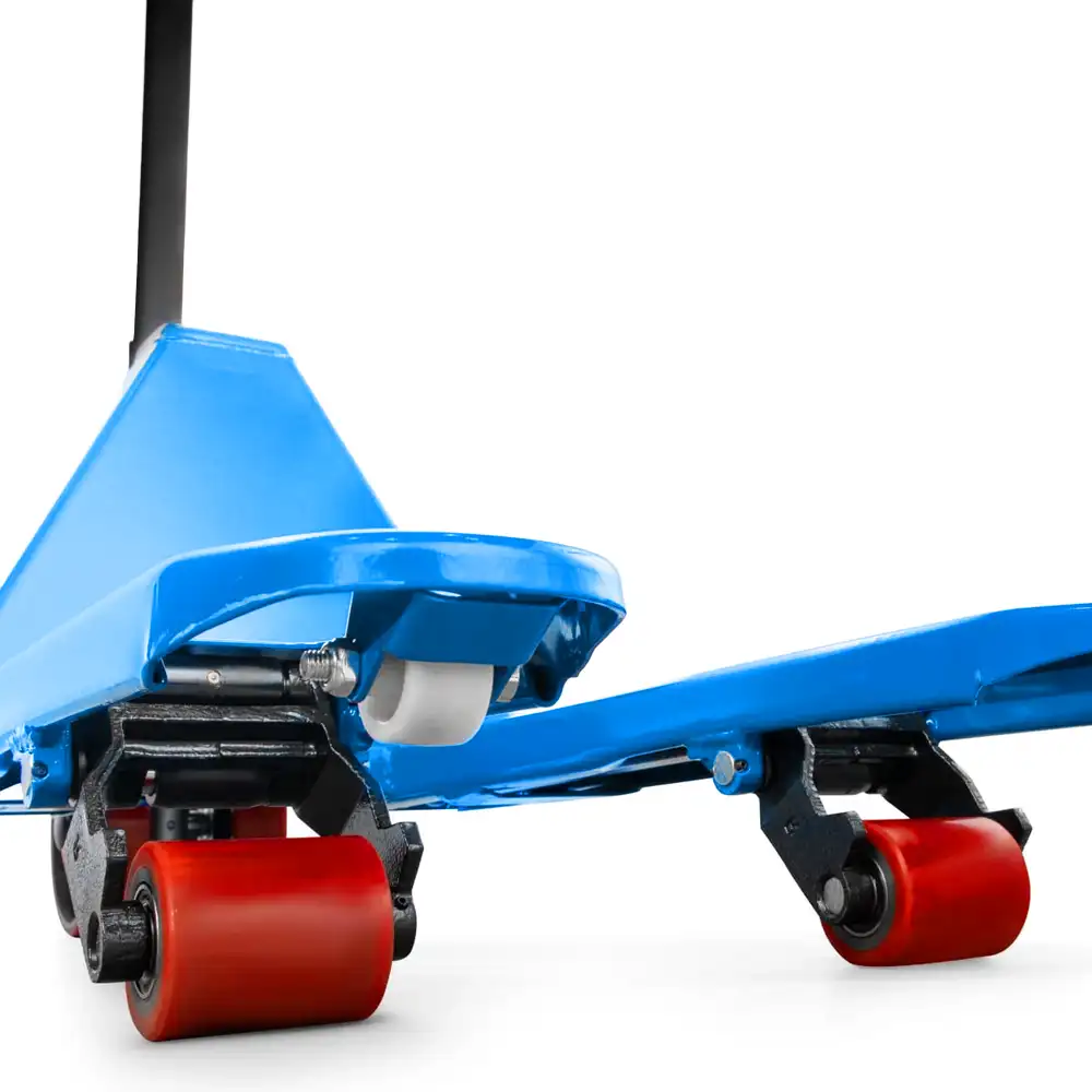 Compacte handpalletwagen (1000 x 540 mm) met 2500 kg hefvermogen, ideaal voor kleine ruimtes en vrachtwagens.