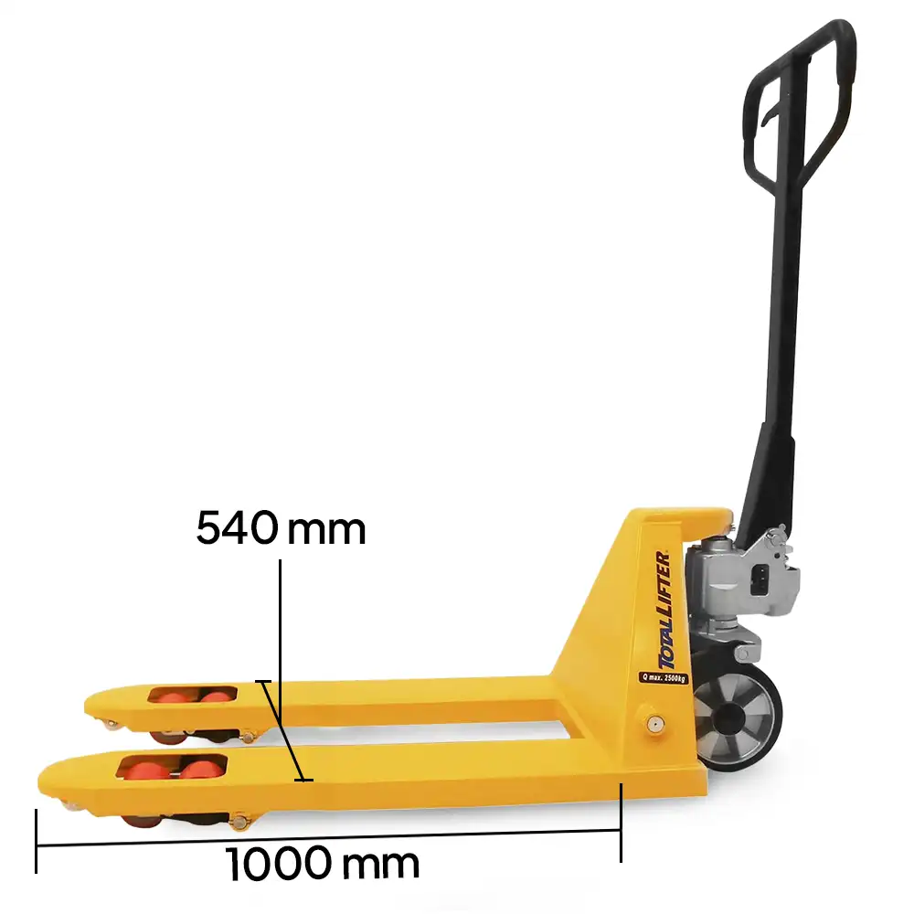 De vorken zijn 1000 mm lang en 540 mm breed, korter dan standaardpalletwagens van 1150 x 540 mm die beter passen bij europallets. Het maximale hefvermogen is 2500 kg en heffen en rijden gebeurt volledig handmatig.