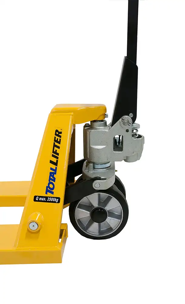 De palletwagen is standaard uitgerust met dubbele polyurethaan vorkwielen en een rubberen stuurwiel, wat zorgt voor een goede demping en anti-slipwerking. Optioneel kunnen de vorkwielen enkel uitgevoerd worden in polyurethaan.